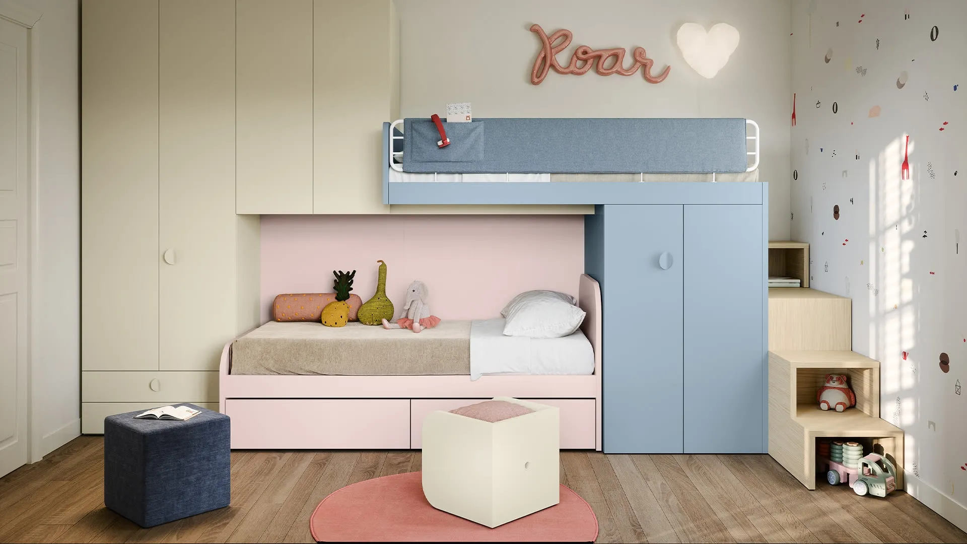 Per progettare al meglio le Camerette, Nidi offre soluzioni progettuali e versatili: sono varie le attività che i tuoi figli portano a termine lì. Con la Cameretta con letti a soppalco di Nidi renderai la stanza dei tuoi figli un ambiente davvero confortevole e sicuro, che li seguirà mentre diventano grandi. Farci visita significa vedere dal vivo tutte le più esclusive soluzioni per bambini a soppalco in melaminico che presentiamo in negozio. Questa proposta con finitura in melaminico, tra quelle a soppalco per bambini di Nidi, accontenta le necessità degli adulti e i gusti dei giovani.